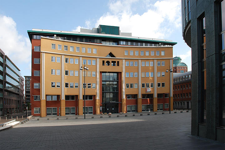 Het timpaan is hier waarschijnlijk alleen gebruikt als versiering, net als de figuren onder het timpaan (cirkel, vierkant, etc., die ook te zien zijn op de afbeelding). Het fries geeft het gebouw schoonheid, maar het zorgt ook voor evenwicht. De zuilen zijn, net als bij het gebouw van Banning Advocaten, gebruikt als link naar de klassieke tijd en voor de schoonheid.