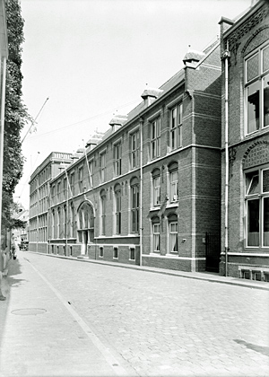 InleidingVoormalig rijksarchief, architect Jacobus van Lokhorst (rijksbouwkundige bij het departement van Binnenlandse Zaken). Opgetrokken in een mengvorm van Neo-Gotiek en Neo-Renaissance met toepassing van een zelfdragend ijzerskelet. Het hoofdgebouw aan de Waterstraat werd ontworpen in 1880 en gebouwd van 1881 tot 1883. Het werk werd aangenomen door Jean van Groenendael uit Loosduinen voor de som van f 57.000. Het nieuwe gebouw bleek spoedig te klein en al in 1886 maakte Van Lokhorst de plannen voor een uitbreiding met een zij- en een achterdepot aan het huidige Anne Frankplein. Het werk werd eind 1887 aanbesteed en gegund aan de Bossche aannemer C. van Straaten voor een bedrag van f 38.960,-. De oplevering had plaats in augustus 1889. Het exterieur van het archief is in de loop der jaren nauwelijks gewijzigd. Intern zijn er wel enkele doorbrekingen en functieveranderingen van kantoorruimtes geweest maar deze hebben het karakter en de bijzondere ijzerconstructie niet noemenswaardig aangetast.Opvallende aspecten zijn de geringe verdiepingshoogte (ca. 2.10 m) van de depots, de smeedijzeren roostervloeren en de laterale verlichting door de vele vensters ter hoogte van de gangpaden waartussen de oorspronkelijk houten archiefstellingen geplaatst waren. Dit ruimtelijk concept werd als voorbeeld gesteld bij de bouw van diverse andere archiefgebouwen in het land. De houten archiefstellingen zijn in 1934 vervangen door de huidige stalen stellingen. Functioneel gezien is ruimtegebrek steeds een van de voornaamste problemen van het gebouw geweest. Na de realisatie van de uitbreidingen is intern geprobeerd dit op te vangen door ook de kelder en zolders voor archiefopslag geschikt te maken. Mede door het grote te dragen gewicht zijn op enkele plaatsen zettingen opgetreden. Het gebouw is gesitueerd in het Zuidwalgebied en gelegen op een terrein dat in de negentiende eeuw voornamelijk een woonfunctie had. De benodigde particuliere percelen werden in het laatste kwart van de negentiende eeuw aangekocht door de staat der Nederlanden. Het archief vormt samen met de in 1897 gebouwde provinciale griffie het grootste gedeelte van de zuidelijke gevel van de Waterstraat. De omlopende bebouwing van het zij- en achterdepot zorgt, komende vanaf de Keizerstraat, voor een imposant gevelbeeld. OmschrijvingHet hoofdgebouw uit de eerste bouwfase van 1881 bestaat uit een vrijwel rechthoekig, gedeeltelijk onderkelderd bouwlichaam dat aan de zijde van de Waterstraat twee bouwlagen met zolder telt en aan de achterzijde uit een vierlaags depot met zolder bestaat. Het gedeelte aan de Waterstraat kreeg een functie als dienstgebouw met vertrekken voor het publiek en het personeel. Per hoofdverdieping van het dienstgebouw zijn er twee niveaus van het depotgedeelte. De gevel aan de Waterstraat volgt de loop van de straat en is iets afgeschuind. Bij de uitbreidingen van 1887-1889 werd aan de achterzijde van het bestaande gebouw een in identieke vormen opgetrokken rechthoekig vierlaags depot gebouwd en op de hoek van de Waterstraat, aan de kant van het huidige Anne Frankplein, een zijdepot van vijf bouwlagen op een onregelmatige grondslag opgetrokken. Bij de constructie van de aanbouwen zijn intern doorbrekingen gerealiseerd. Het zijdepot heeft een zadeldak met trapgevelbeëindiging aan de Waterstraat. De trapgevel wordt verder bekroond door een schilddragende stenen leeuw. Opvallende elementen zijn verder de drie verschillend uitgevoerde traptorens aan het Anne Frankplein; een driezijdige voor het zijdepot, een ronde op de scheiding van de voorbouw en het achterdepot en een rechthoekige aan de achterzijde van het achterdepot. Het gebouw is grotendeels op beton gefundeerd. Alle gevels zijn uitgevoerd in schoon metselwerk van in kruisverband gemetselde machinale baksteen met een geknipte en gesneden voeg. De verschillende zadeldaken en torenspitsen zijn gedekt met pannen en met leien in Maasdekking. De zelfdragende ijzerconstructie van de depots bestaat uit los van de gevels staande en tussen de vensters geplaatste ijzeren jukken die per verdiepingsvloer een roosterwerk van ijzeren balken ondersteunen. Tussen de jukken zijn de archiefkasten opgesteld. De vloeren van de looppaden tussen de stellingen zijn als smeedijzeren roostervloer uitgevoerd. Ook de paden langs de gevels zijn voorzien van roostervloeren. De vloeren van het dienstgebouw en de begane grond en zoldervloer van de depots zijn opgebouwd uit ijzeren balken met gemetselde troggewelfjes. Voor de kapconstructie zijn Polonceauspanten van getrokken ijzer toegepast. Het overige draagwerk van de bekapping is eveneens in ijzer uitgevoerd. Het dakbeschot is van hout.De voorgevel aan de Waterstraat telt vier traveeën en wordt geleed door waterlijsten van profielsteen die tevens als vensterafzaat dienen. De hoofdingang van het gebouw wijkt in hoogte niet af van de ernaast geplaatste vensters en is voorzien van een met mascarons en cartouches geornamenteerde pilasteromlijsting van Udelfanger zandsteen met dubbel entablement en een ontlastingsboog aan de bovenzijde waarin een reliëf is aangebracht met zittende engeltjes die een cartouche met RIJKSARCHIEVEN vasthouden. De ingang heeft een kleine hardstenen trap en is voorzien van een recht gesloten, geornamenteerde, houten vleugelpaneeldeur. De vensteropeningen zijn alle recht gesloten en hebben aan de bovenzijde een ontlastingsboog met polychroom siermetselwerk in de trommel. Bij de verdiepingsvensters zijn deze bogen segmentvormig. De vensters zijn voorzien van kruiskozijnen en hebben glas-in-lood in de bovenlichten. Een opvallend accent wordt verder gevormd door de siersmeedijzeren steekankers met krulwerk. De goot rust op consoles. In het dakschild aan de Waterstraat zijn kleine dakkapellen aangebracht. De zijgevel van het depot van het hoofdgebouw aan het Anne Frankplein is sober en doelmatig gehouden. Het accent ligt hier op een optimale lichttoetreding. Deze wordt bereikt door op elke bouwlaag per travee twee gekoppelde