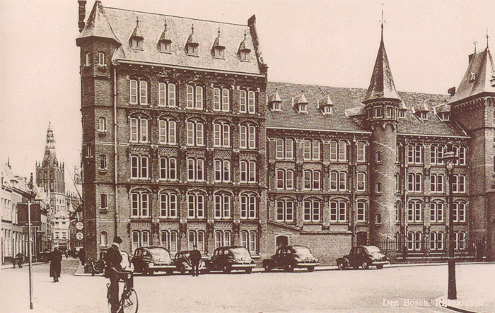De Waterstraat, een straat in het stadscentrum met aan een zijde een foeilelijke parkeergarage en aan de andere zijde overheidsgebouwen. Eens zetelde hier het provinciaal bestuur. En in het hoekpand was eens het Rijksarchief gevestigd; we nemen een kijkje achter de voorgevel van: Waterstraat 20. In 1837 werd in een vergadering van Provinciale Staten voor het eerst gesproken over de noodzaak van het realiseren van een archiefbewaarplaats in de provincie. Pas in 1859 werd er ruimte voor gereserveerd in de bestaande griffiegebouwen. Omdat echter het aantal archieven in strekkende meters bleef groeien en het aantal bezoekers toenam, werd naar een andere oplossing gezocht. het Rijk zou een archiefgebouw bouwen, waarin ook de archieven van de provincie onderdak konden krijgen. In 1876 en 1877 werden gronden naast het griffiegebouw verworven en kon een ontwerp gemaakt worden. Degene die het ontwerp maakte, re rijksbouwkundige J. van Lokhorst, moest er rekening mee houden dat er eventueel nog een stuk grond verworven kon worden. Het meest rechtse deel van het plangebied was namelijk in handen van smid Smulders en deze wilde voorlopig zijn smederij behouden. Lokhorst maakte een eenvoudige opzet. Aan de voorzijde plande hij een dienstgedeelte van twee hoofdverdiepingen en aan de achterzijde een depot van vier halve verdiepingen. In het midden lag een centraal trappenhuis. 's Rijks architect voor de museumgebouwen, P.J.H. Cuypers, vond de opzet van de hoofdingang te schraal, te arm. Hij maakte ook opmerkingen over de zijgevel en het materiaalgebruik. De minister nam de adviezen van Cuypers over en Lokhorst wijzigde zijn ontwerp. In 1881-1883 werd het archiefgebouw gerealiseerd. Snel bleek echter dat er geen ruimte meer was voor de aanwas van nieuwe archieven; de commissaris des Konings had hiervoor reeds gewaarschuwd! De archivaris was echter tevreden: 'het gebouww is zeer droog, de brandblusmiddelen zijn perfect'. Het bleek dat het bluswater vanuit de Binnendieze opgepompt werd en opgeslagen in een vat op de zolder! In 1886 ging smederij Smulders failliet. Hierdoor ontstond de mogelijkheid een uitbreiding van het archiefgebouw te realiseren aan de zuidzijde. Dat gebeurde dan ook. Er kwam een forse uitbreiding en zeker aan depotruimte zou men voorlopig geen gebrek hebben. Het was juist in de periode dat rijksarchivaris Krom hier de scepter voerde. Hij wist vele archieven te verwerven die in zijn depots onderdak kregen. Later noemde hijzelf deze periode dan ook 'mijn negentien reis- en verzameljaren'. Ondermeer alle notariële archieven van Noordbrabantsche notarissen van vóór 1811 werden er ondergebracht. Het is opmerkelijk dat het Rijksarchief toch zo lang aan de Waterstraat is gehuisvest, want met name de groei van bezoekers en de aanwas van archieven noopten steeds tot het kiezen van nieuwe oplossingen. Zo werden archieven ondergebracht in een oude legerbunker op de Veluwe en in een magazijn in Den Bosch. In 1966 werd het principebesluit genomen om te komen tot een nieuwe huisvesting voor het Rijksarchief. Bijna twintig jaar later werd dit gerealiseerd in de voormalige Citadel. In 1985 verhuisde het Rijksarchief en het oude gebouw werd bestemd tot depot voor de archieven van Justitie die nog niet openbaar zijn. En in de toekomst? Justitie zal verhuizen naar het nieuwe plan La Gare en het oude archiefgebouw zal weer leeg komen te staan. Het is niet bekend wat de nieuwe funktie van dit markante gebouw (met een hoofdgebouw uit 1883 en depots uit 1887) zal worden. |