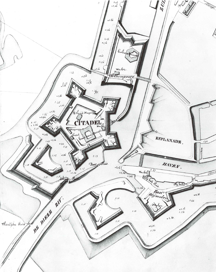 De Citadel : nu Brabants Historisch Informatie Centrum (BHIC)In 1639, tien jaar na de inname van de stad door de Staatse troepen onder Frederik Hendrik, werd de citadel aangelegd.De citadel was onderdeel van de vestingwerken en dwangburcht voor de katholieke stad en kreeg de bijnaam Papenbril. De officiële naam was fort Willem Maria. Voor de aanleg van het fort werd een gebied van circa 4 hectare van de binnenstad langs de Orthenstraat gesloopt. Het ontstane open terrein, Esplanade genoemd, diende vervolgens als vrij schootsveld tussen citadel en stad. De citadel heeft een vijfhoekige vorm met bastions. Ter verbetering van de doorvaart werd één bastion afgebroken na aanleg van de Zuid-Willemsvaart in de 19e eeuw. Het oudste nog authentieke gebouw is het 18e-eeuwse kruitmagazijn. De sortiepoort en het voormalig arsenaal aan de noordzijde van de citadel zijn geheel herbouwd tijdens de grote restauratie en verbouwing ten behoeve van het Rijksarchief in 1983. Het in 1900 in neorenaissancestijl gebouwde poortgebouw bij de ingang is een ontwerp van ingenieur-kapitein M. Onnen. Het hoofdgebouw op de citadel werd gebouwd kort na 1789 als militaire gevangenis, oftewel de Geweldiger. Het heeft vier vleugels in carré-vorm, gerangschikt rond een binnenplaats. In de 19e eeuw kreeg het gebouw als kazerne het huidige uiterlijk: drie achtervleugels werden op gelijke hoogte opgetrokken als de voorvleugel. Tijdens de ingrijpende restauratie/herbouw in 1983 werd de binnenplaats overdekt. In de vloer van de nieuwe, tussen de funderingsbogen aangelegde kantine van het archief, ziet u de plaats aangeduid van de middeleeuwse stadsmuur en Orthenpoort die hier tot 1639 stond.