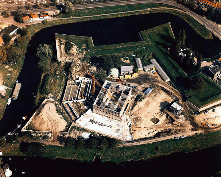 Toen Den Bosch in 1629 veroverd werd, was er nog geen Citadel. Op dezelfde plaats bevond zich toen 'het bastion aan de Boom'. Tien jaar later besloot de Staten generaal dat de veroverde stad een blokhuis of dwangburcht zou krijgen om de Spaansgezinde, katholieke en onbetrouwbare bevolking onder controle te kunnen houden. Tegelijk zou het fort - door bemiddeling van Frederik Hendrik - onderdeel kunnen uitmaken van de vestingwerken van de stad. Het was immers 1639 en niemand kon toen bevroeden dat het nog negen jaar zou duren vóór de grote strijd de Tachtigjarige Oorlog, met de Vrede van Munster zou eindigen. Om de functie van dwangburcht te kunnen uitoefenen moest er een schootsveld richting stad komen. Daartoe werden 43 huizen en een kerk, de Sint-Petrus en Pauluskerk, gesloopt. het lege terrein werd De Plein genoemd. het fort zelf kreeg verschillende namen 't Kasteel (zo aangeduid op een plattegrond), fort Willem-Maria (de officiële naam), de Papenbril (door Bosschenaren gegeven spotnaam) en de Citadel (vanaf de achttiende eeuw). Het fort kende vijf bastions. Verschillende functies heeft de Citadel later gekend. Het was een militaire gevangenis en een kazerne. Het hoofdgebouw van de kazerne dateert uit het einde van de achttiende eeuw; een eeuw later werd dit gebouw uitgebreid met vier vleugels. Vóór de Citadel stroomt de Zuid-Willemsvaart. Bij een verbreding van dit kanaal werd één van de vijf bastions afgebroken. Door het aannemen van de Vestingwet in 1874 verloor het fort haar stadsverdedigende functie. Maar er gebeurde in dat jaar weinig met het gebouw zelf: er werd enkel een nieuw wachtlokaal gebouwd aan de buitenzijde van het fort. Maar door het aannemen van deze wet kon wel De Plein, het schootsveld van het fort, bebouwd worden. In het laatste kwart van de negentiende eeuw werd het blok Jan Heinsstraat, Handelskade, Zuid Willemsvaart volgebouwd. Een kwart eeuw geleden verlieten de militairen de Citadel. Een duidelijke bestemming had de Rijksgebouwendienst niet. Er werd gedacht aan het Rijksarchief, maar ook aan een bejaardentehuis... Intussen maakten anderen gebruik van de ruimten. Er was ondermeer een concertzaal en een jongerensoos; de autohobbyclub van de PTT had er een garage. In het begin van de jaren tachtig kwam er duidelijkheid. De Rijksgebouwendienst bestempelde de Citadel als een nieuwe huisvesting voor het Rijksarchief in Noord-Brabant. Ahrens Kleijer Baller Architekten BNA uit Oosterbeek maakten een ontwerp voor de nieuwe bestemming. Er werden depots in de wallen van het fort getekend, de negentiende eeuwse toevoegingen aan het hoofdgebouw sloopte men, de binnenplaats van het hoofdgebouw kreeg een overkapping, de Noorderpoort werd teruggebouwd en er werd een restauratieatelier gerealiseerd. Er werden kelders onder gemaakt die gedeeltelijk daglicht ontvangen door de grote lichtopeningen aan weerszijden van het pand. In juli 1985 werd het geheel opgeleverd door Bouwbedrijf van der Linden uit Sint Michielsgestel. Het oudste gebouw in het voormalige fort is het kruithuisje, dat uit 1750 dateert. Op een van de bastions bevindt zich nog de zogenaamde Wilhelminaboom. Het gehele fort is te bezoeken tijdens de openingstijden van het Rijksarchief. Rondleidingen worden er gehouden door de Kring Vrienden van 's-Hertogenbosch. Is het militaire element helemaal verdwenen en alleen nog terug te vinden in de eeuwenoude papieren van het Rijksarchief? Nee, iedere zondagmiddag schiet het Schuttersgilde De Oude Schuts (de stedelijke verdedigers van vóór 1567) er nog met de kruisboog en ook De Bossche Schutterij houdt er regelmatig exercities en schiet er met de kanonnen die zich op de wallen bevinden. Maar wel met losse flodders. |