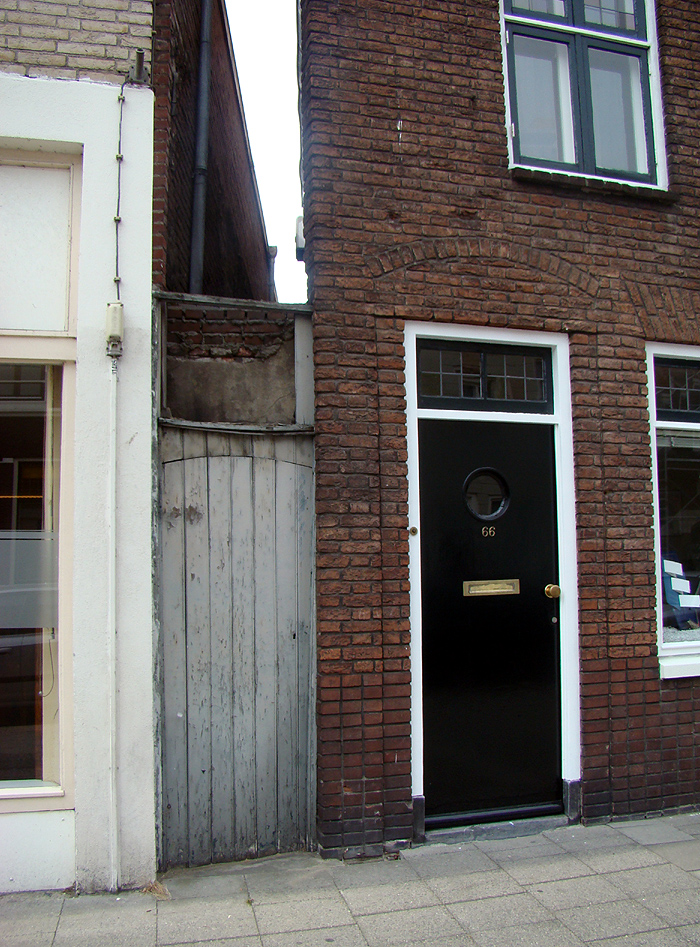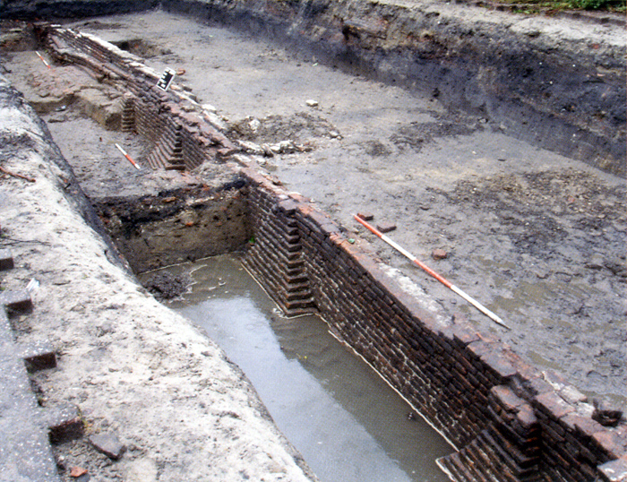 Fundering van het 15e-eeuwse gebouw achter Hinthamereinde 66. De muur is zwaarder uitgevoerd op de plaatsen waar staanders van een houtconstructie hebben gestaan. Links van de muur bevond zich het steegje 'Achter de Groene Jeger'.