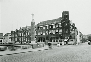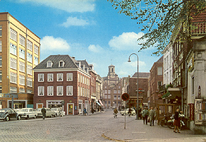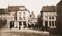Het was een plein aan de kop van de Haven: de Vismarkt. De doorgang naar de Dommel ontbrak nog en het gedeelte Visstraat dat er was (tussen Hoge Steenweg en Karrenstraat) was smal. Vooral dat laatste is duidelijk te herkennen aan een foto van zo'n zestig jaar geleden. Links, op de hoek met de Smalle Haven bevond zich de kiosk Lectura, waar ondermeer 'alle dagbladen' te koop waren. Daarnaast was de befaamde banketbakkerij van H. van der Zijde. Rechts, op de hoek met de Karrenstraat, stond de Rotterdamse Bank. Het was een oud bankgebouw, dat omstreeks de eeuwwisseling het kantoor was van de bankiersfamilie Van Rijckevorsel. Later kwam dit pand in handen van de Credietvereeniging 'de Hanzebank'. Deze heeft daar echter niet zo lang gebruik van gemaakt, want deze bank ging omstreeks 1930 failliet. Daarna vestigde er zich de Rotterdamse Bank. Naast de bank bevond zich de befaamde zaak in Bossche koek en chocoladebollen: Lambermont, 'de zaak met de antieke koekkist', die uit het eind van de achttiende eeuw dateerde. en daar weer naast, op de hoek met de Karrenstraat was het kinderkledingmgazijn De Einder gevestigd. Recht vooruit, in de Hoge Steenweg ontdekken we enkele panden waarin thans de Bankiers Van Lanschot gevestigd zijn. De bankier bezat er een negentiende eeuws pand en daarnaast was de firma M.L. van Bergen, sanitaire installaties gevestigd. Boven deze panden uit torende het markante silhouet van de Sint-Pieter. En op straat ontdekken we naast voetgangers slechts enkele fietsers. En toen kwam de bevrijding in oktober 1944 dat ook in dit deel van de stad voor grote verwoestingen zorgde. De panden op de voorgrond van de foto werden totaal verwoest. Maar er kwam herbouw. Op de hoek met de Smalle Haven kwamen moderne winkelpanden en ook aan de andere zijde kwam nieuwbouw. Echter de gemeente eiste dat de rooilijn verlegd moest worden: de Visstraat moest breder. Daarom herbouwde de Rotterdamse Bank zijn nieuwe panden enkele meters naar achter, Ernaast vestigde zich Tecklenburg, de vishandel. Deze laatste nieuwbouw met name zorgde ervoor dat de intieme Vismarkt - die al aangetast was door de nieuwe straat richting station - nog meer een open karakter kreeg. En ook op de achtergrond veranderde het een en ander. Van Lanschot had de panden ernaast verworven en deze doen 'restaureren', dat wil zeggen er verschenen moderne panden, gebouwd naar een middeleeuws voorbeeld uit Brugge! Toeristen die er nu foto's van maken en denken met authentieke monumenten te maken te hebben, weten niet dat de panden nog geen vijftig jaar oud zijn! Ook het stadssilhouet boven de bank veranderde. Was dit al aangetast door de nieuwbouw van een flat aan het Burgemeester Loeffplein, door de sloop van de Sint-Pieter in 1982 werd het flink aangetast: het stadsgezicht van 's-Hertogenbosch was opnieuw veranderd. |