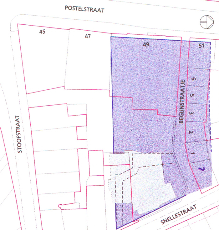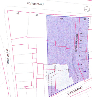 Huidige kadastrale situatie van het Klein Begijnhof (paars). Het grijze gedeelte is in 2002-2003 opgegraven. De stippellijn door het grijze/paarse gedeelte is het straatje genaamd Klein Begijnhof.(Tekening: drs. F.C. Schipper, BAM)