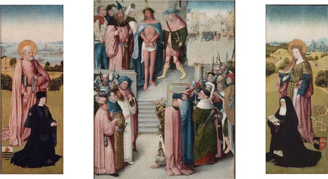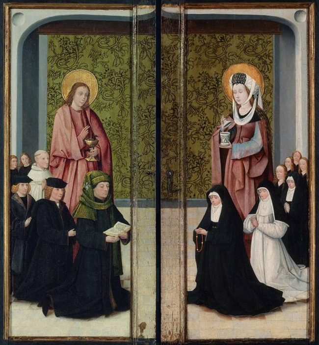 De man op het buitenluik is Franco van Langel, stadssecretaris en tevens gezworene tot zijn dood in 1497.64 Zijn zonen zijn Wouter, Franco65 en Jan, de laatste kloosterling en later prior van Marienkroon te Heusden.66 Dat ook hier een andere heilige voorkomt