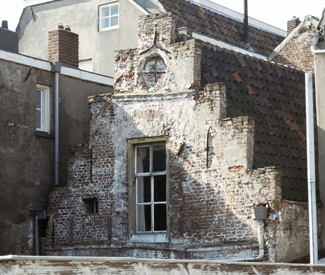Het bovenste deel van de trapgevel in 1993. Onder het venster de horizontale band in natuursteen, erboven de boog in baksteen afgewisseld met blokken natuursteen.Een oud stukje stad