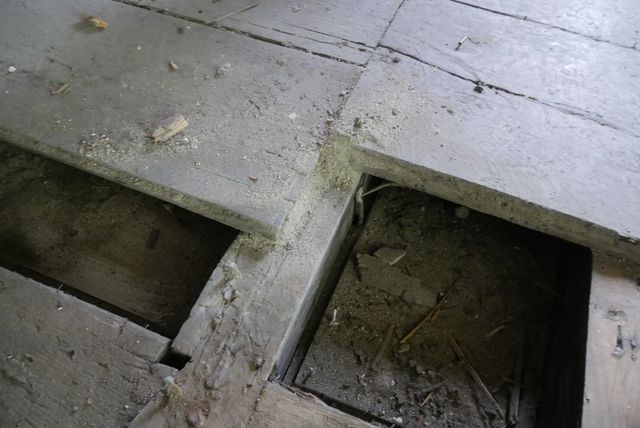 De eikenhouten planken van de vloer liggen boven de moerbalk en kinderbinten: alles 500 jaar oud!Peerkraal