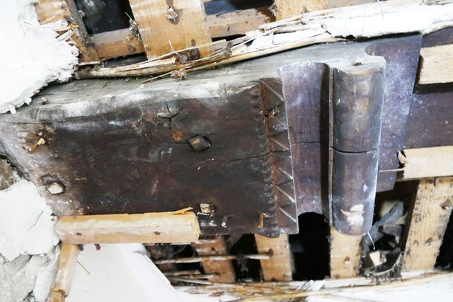 Bij het verwijderen van de plafonds die later ingebracht zijn, komt de oorspronkelijk console met versiering in houtsnijwerk tevoorschijn: de ‘peerkraal’.Een kap met lange nokstijl