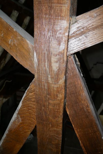 De verticale ‘nokstijl’ is aan de andere balken bevestigd door middel van ‘schoren’. De onderdelen zijn aan elkaar vastgemaakt door middel van 'pen en gat'.
