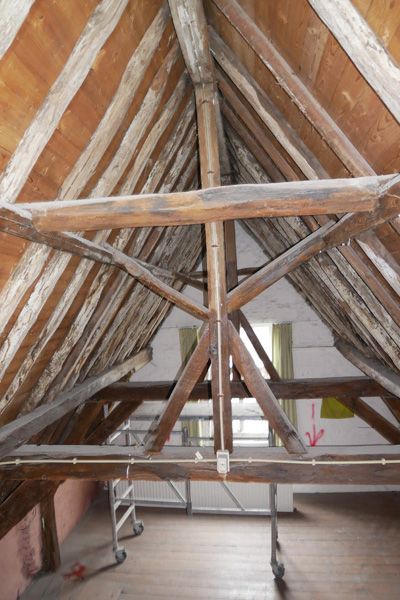 De bijzondere kapconstructie: op de zware, horizontale balken van eikenhout (‘dekbalkspant’) staat een verticale stijl die de nokbalk draagt. Het dakbeschot is bevestigd op ‘sporen’, dunnere balken die van nok tot dakvoet lopen.