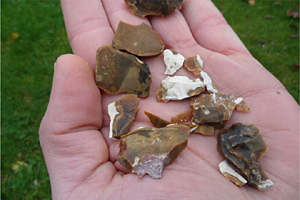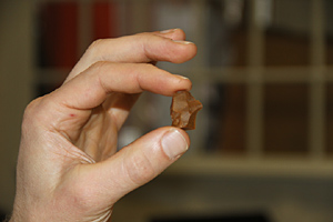 Op 1 november 2012 heeft archeoloog Stefan Molenaar van de afdeling Bouwhistorie, Archeologie en Monumenten (BAM) een bijzondere vondst gedaan. Tijdens de aanleg van een amfibieënpoel langs de Sterrenbosweg heeft hij fragmenten van bewerkte vuursteen aangetroffen. Het is aannemelijk, dat de vondsten dateren uit het mesolithicum en tussen de zevenduizend en negenduizend jaar oud zijn. Als er werkzaamheden in het Bossche Broek uitgevoerd moeten worden, wordt vooraf eerst archeologisch onderzoek verricht (standaardprocedure). In de buurt van een aan te leggen amfibieënpoel aan de Sterrenbosweg, is ooit een schat aan Karolingische munten gevonden. Desondanks heeft het gebied op de gemeentelijke archeologische verwachtingskaart een lage verwachting. Daarom was het archeologisch onderzoek beperkt tot een controle van de ontgraving. Bij zijn komst ter plaatse zag Stefan Molenaar grillig gevormde plekken/vlekken. "In eerste instantie dacht ik niet aan grondsporen; met een bats heb ik enkele lagen modder afgeschaafd, zodat je een mooi egale oppervlakte krijgt", geeft Stefan aan. Plotseling hoorde hij een tik van de schop, en er kwam een vuursteentje (1 x 2 cm) tevoorschijn. Bij nader onderzoek bleek het een artefact te zijn, een niet door de natuur gevormd object. "Vuursteen is van een glasachtige samenstelling, waarmee je scherpe randen krijgt als je erop slaat. Bovendien is het goed aan te scherpen. Bewerkte vuursteen is zeer bruikbaar als (snij)gereedschap, bijvoorbeeld voor het schrapen van huiden, maar ook kun je er pijlpunten van maken", licht Stefan toe. AntropogeenHoe kun je nu zien dat hier sprake is van een antropogeen, een door mensen gemaakt, object? Dorsaal (rugzijde) waren plekken waarneembaar, waar andere vuursteenfragmenten op systematische wijze waren afgeslagen. Ventraal (buikzijde) was een slagbult aanwezig; het slagvlak is het punt waarop geslagen wordt, de resultante is een slagbult. "Met neusvet kun je een slagbult glimmend maken", demonstreert Stefan. Als je met een houten voorwerp (zoals een gewei) afslaat, krijg je een kleine slagbult; dat wordt een 'zachte percussie' genoemd. Sla je met een steen af, krijg je een grovere, grotere slagbult ('harde percussie'). In het tijdvak paleolithicum (300.000 tot 10.000 jaar) kwamen naast zachte percussies vooral harde percussies voor, met korte en gedrongen slagbulten. In de periode daarna (mesolithicum) zag je meer zachte percussies, met 'klingen', hierbij is de lengte groter dan de breedte. Maar al vanaf circa 35.000 jaar v. Chr. (laat-paleolithicum) werden her en der klingen | 6 |