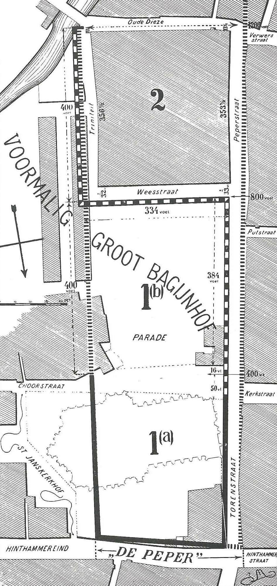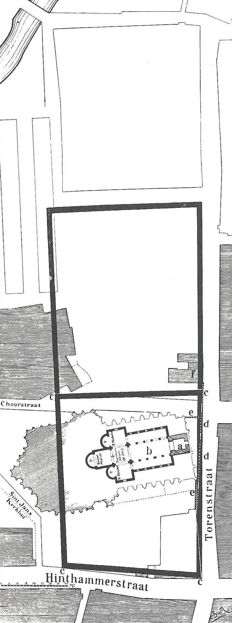 Het atrium te 's Hertogenbosch, zooals dat in een perkament van 1222 vernoemd wordt, was dan ook de rondom de St Jan opengehouden, langwerpig vierkante ruimte van 300 x 800 voet, zich in de lengte langs Toren- en Peperstraat uitstrekkend.7