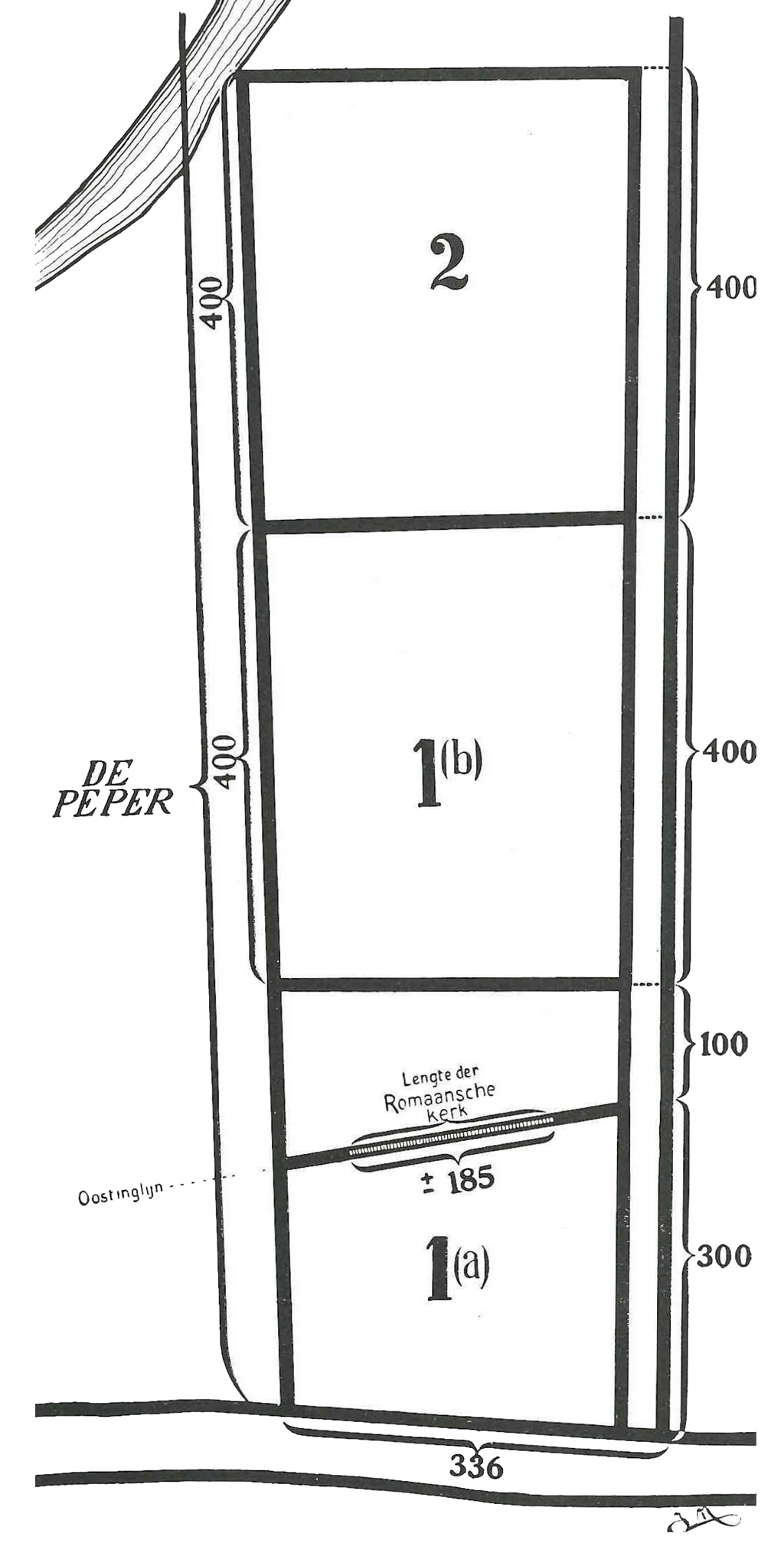Afb. 4. „De Peper” zooals die waarschijnlijk in de lengte was verdeeld, met over het eerste gedeelte (1a) getrokken Oostinglijn voor de kerk.