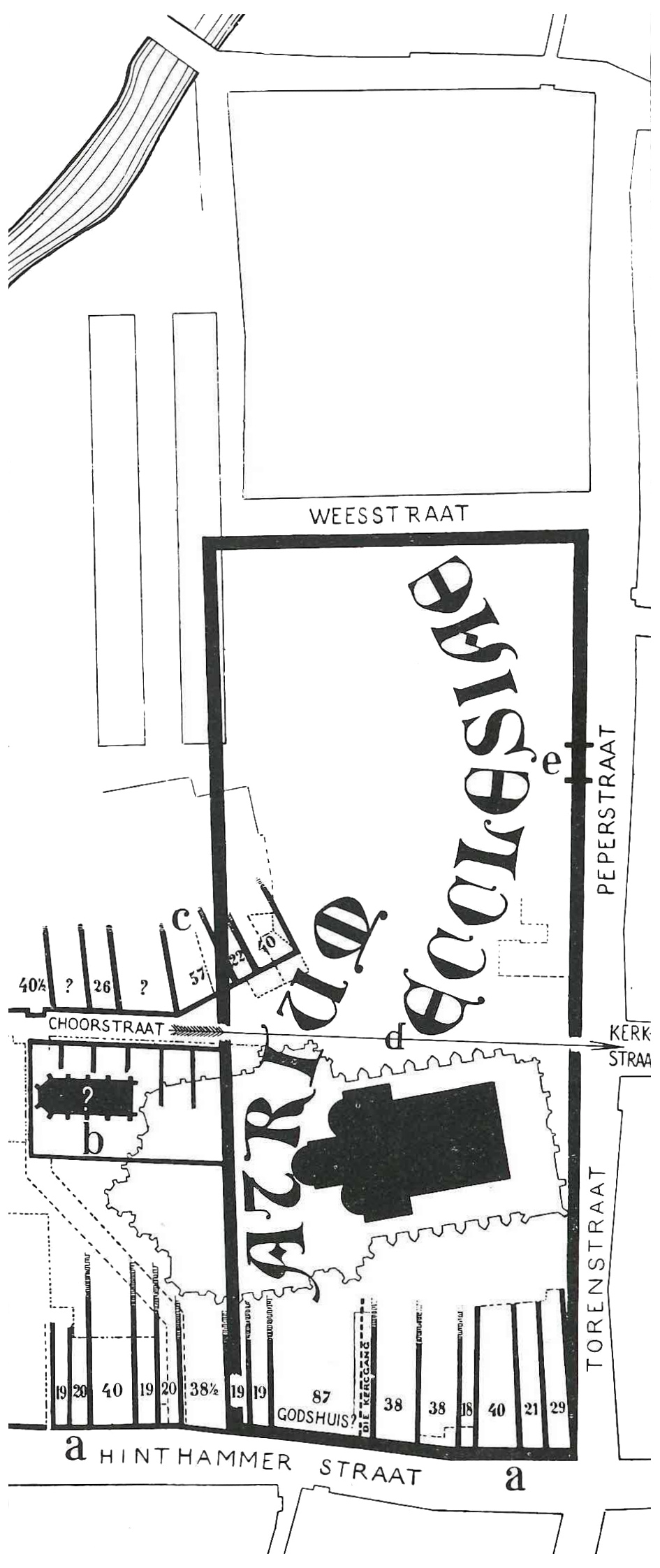 Afb. 5. Toestand van het atrium in het midden der XIIIe eeuw. a. Erven, in het eerste kwart of de eerste helft der XIIIe eeuw uitgegeven langs de Noordzijde met hunne breedte in voeten. b. Vermoedelijke plaats van het oorspronkelijke Bagijnhof. c. Erven, als voren, langs de Choorstraat. oorspronkelijk de „vicus tendens à cimeterio”