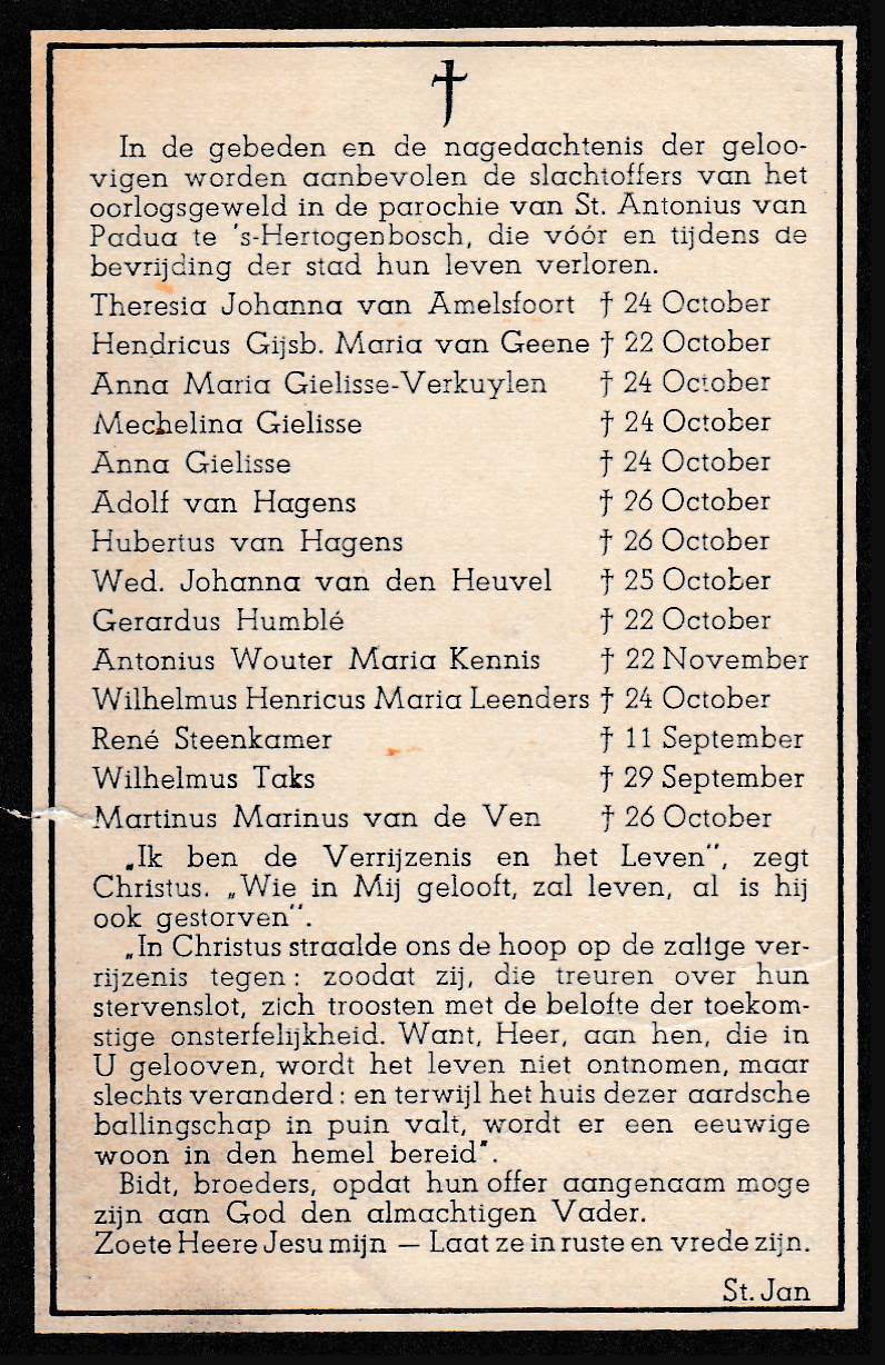 Onderstaande personen zijn op het bureau van den burgerlijken stand te 's-Hertogenbosch geregistreerd als zijnde gesneuveld tijdens de oorlogsdagen van 22 oct. af. De lijst is nog niet volledig, daar nog niet alle registraties hebben plaatst gevonden.