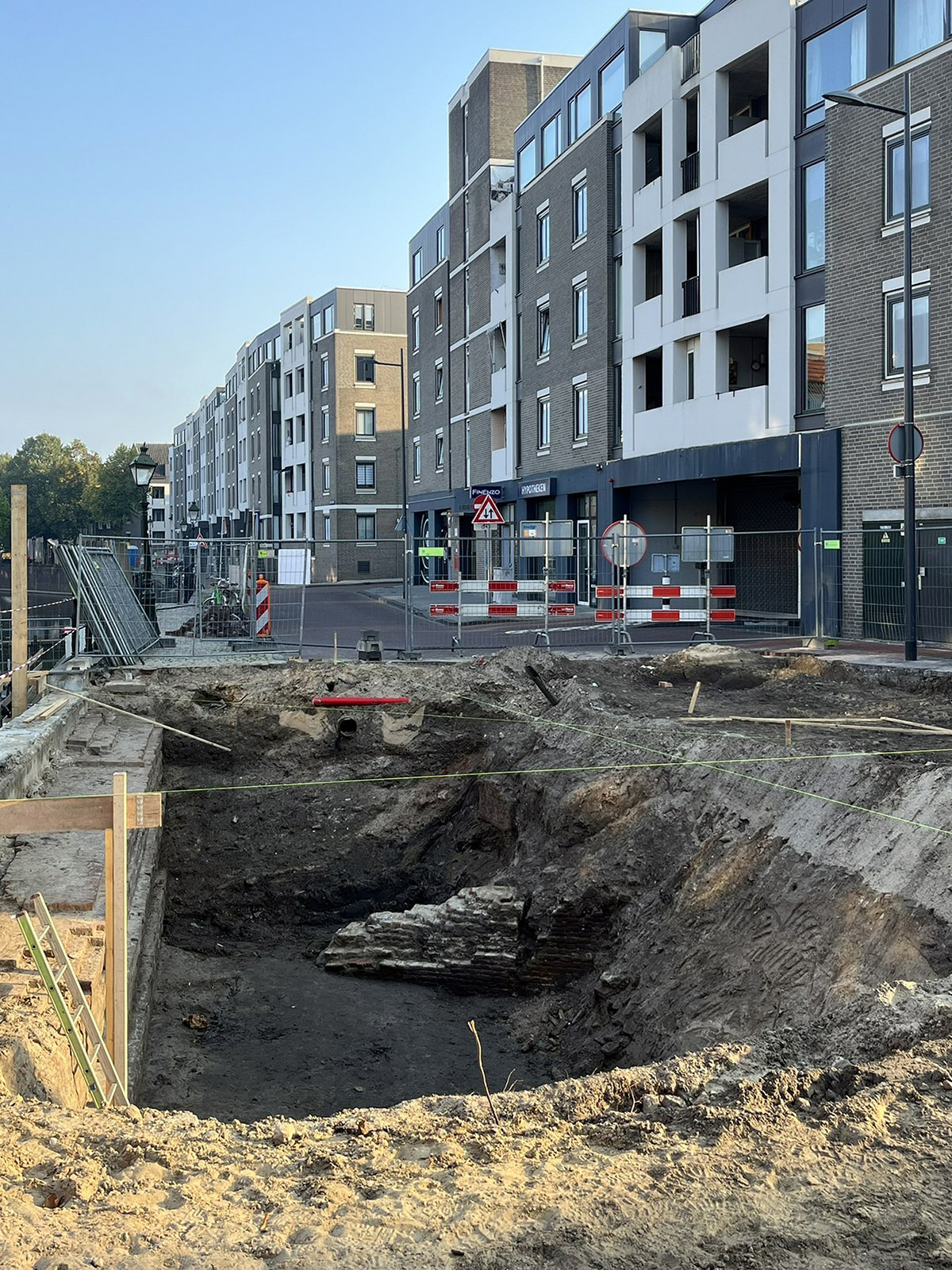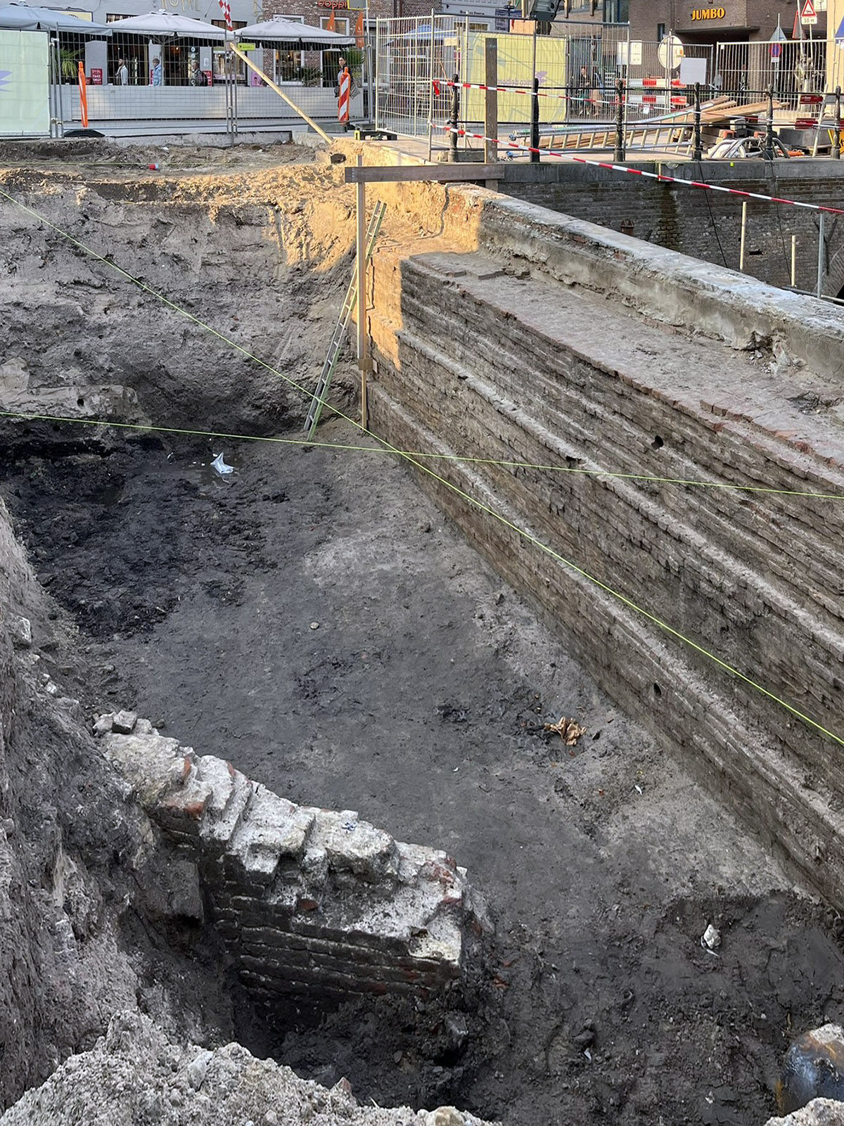 - Om de trap te kunnen bouwen, moeten we een nieuwe muur achter de huidige kademuur plaatsen om het hoogteverschil op te vangen.