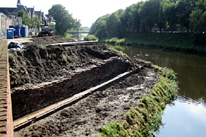 Vieze grond bij bolwerk weg• A&G graaft vervuilde grond Sint Jansbolwerk verder af.• Archeologen BAAC onderzoeken opnieuw bodem en vrijgekomen deel stadsmuur. • Aparte gaten in stadsmuur aangetroffen: mogelijk draaggaten voor houten balken.