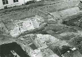 afb. 1. Overzicht van een deel van de opgraving van het Fratershuis. Op de achtergrond is de overkluizing van de Binnendieze te zien. Op de voorgrond rechts bevindt zich één van de funderingskolommen van de 19de eeuwse glasblazerij. Links daarvan ligt de zware fundering en een kelder van het Fratershuis.