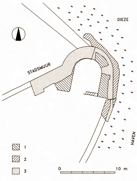 Plattegrond van het opgegraven muurwerk van de wesfelijke toren van de Boompoort. Legenda: 1. eerste helft 14e eeuw 2. verbouwing Boompoort 1448 3. restauratie 19e eeuw Onderzoek aan de buitenzijde van de toren kon toen nog niet plaatsvinden, aangezien 26 deze zich nog in het water bevond. In juni was het mogelijk om aan de buitenzijde een beperkte waarneming te verrichten. In verband met het herstel van de buitenzijde van de toren werd hier een damwand geplaatst en het gedeelte langs de toren leeggepompt. Op vrij grote diepte kwam hierbij de oude fundering van de toren in het zicht. Deze bleek een veelhoekige vorm te hebben (zie afb. 1), in tegenstelling tot de huidige halfronde buitenkant. De hoekige vorm is ook herkenbaar op enkele afbeeldingen uit de 16de eeuw. De toren was op de waterlijn bekleed met grote hardstenen blokken, die het metselwerk moesten beschermen tegen de eroderende werking van het water en tegen beschadiging door schepen. In één van deze blokken was een verticale sleuf uitgehouwen. Het is niet uitgesloten dat deze sleuf samenhangt met een valhek waarmee de haventoegang afgesloten kon worden. Uit de steenformaten van de buitenzijde van de toren blijkt dat deze minder oud is dan de binnenzijde. Vermoedelijk is de hoekige buitenschil aangebracht bij de aanleg van de nieuwe Boompoort in 1448. Na het onderzoek is de hoekige buitenzijde van de toren grotendeels weggekapt. Bij de renovatie zal de toren voorzien worden van een nieuwe, ronde buitenschil. | 26 |