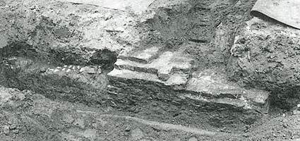 Westmuur van de Pijnappelse Poort met aan de binnenzijde een restant van de oorspronkelljke bestrating van veldkeien. Het is opmerkelijk dat de poort pas zo laat is afgebroken omdat de uitleg van het Hinthamereinde al in de eerste hele van de 16de eeuw plaats vond. Ondanks de versterkte uitleg blijft de oude stadsmuur en poort met bijbehorende gracht gehandhaafd en kan op deze lokatie als tweede verdediging beschouwd worden. Dezelfde situatie geldt ook voor de latere uitleg aan de Vughterstraat waar de oude stadsmuur ook nog lang gehandhaafd blijft. Uit het onderzoek is gebleken dat de Pijnappelse Poort een rechthoekige plattegrond had. De binnenmaten van de poort zijn 6.30 m (lengte) bij 5.95 m (breedte). De muren met een dikte tot ruim 2 meter bestonden uit baksteen gemetseld in Vlaams verband. Aan de noordzijde bevond zich nog een aanzet van het gewelf van een brug over de gracht. Deze stenen brug dateerde vermoedelijk uit de 16de of het begin van de 17de eeuw. Opmerkelijk is dat zich binnen de poort nog een restant van de oorspronkelijke bestrating bevond, bestaande uit veldkeitjes, daterend uit de 14de eeuw (zie afb. 1). Deze bestrating bevond zich op een hoogte van ongeveer 4.75 m +NAP, dit is slechts 80 cm onder het huidige maaiveld. Binnenkort zal aansluitend aan de poort een onderzoek naar de stadsmuur ter plaatse van het Andriesstraatje verricht worden. Foto: Stadsarchief (0000521)