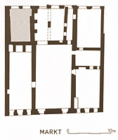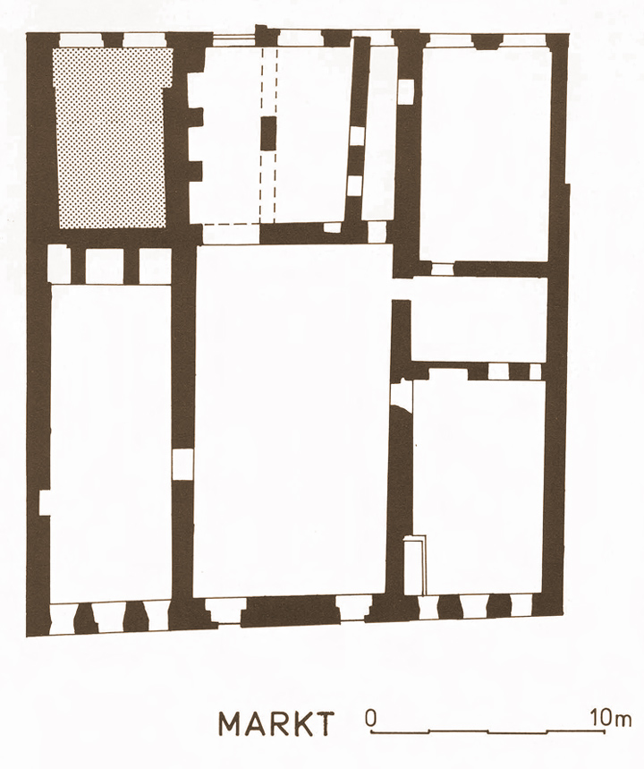 Op deze vereenvoudigde kelderplattegrond van het stadhuis is de onderzochte kelder gerasterd weergegeven. Bovendien is goed te zien dat het huidige monumentale gebouw in feite uit drie middeleeuwse huizen bestaat. Dit maakt de archeologisch vastgestelde niet-synchrone ontwikkeling van deze percelen verklaarbaar.