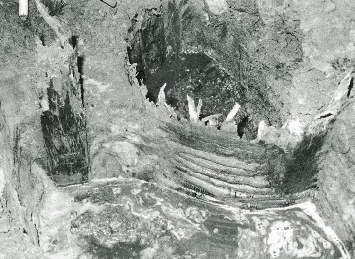 Een als beerput gebruikte houten tonput, aan de onderzijde omwonden met twijgen die op hun beurt weer omwikkeld waren met dunne reepjes boombast. Een dergelijke zorgvuldige constructie geeft aan dat deze ton of kuip oorspronkelijk voor andere doeleinden moet zijn gebruikt. De balk links heeit onderdeel gevormd van een bovenbouw. Het geheel dateert uit het einde van de dertiende eeuw. In deze put werd het hier eveneens afgebeelde kogelpotje gevonden. | 32 |