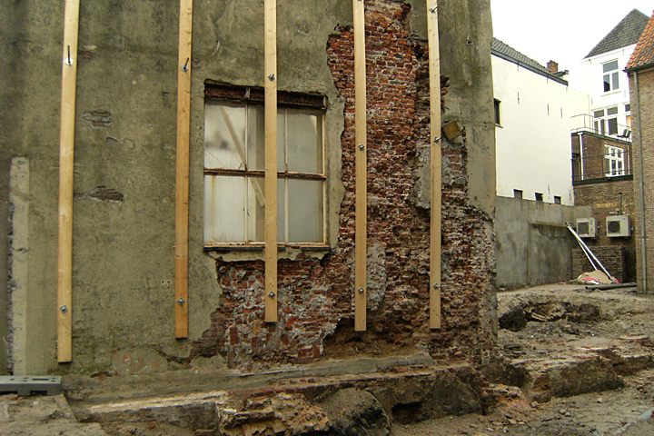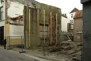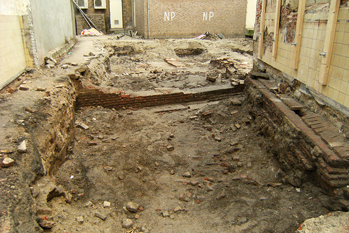 De fundering en de kelderTijdens het onderzoek werd vastgesteld dat zich vrij kort onder het maaiveld muren bevonden die behoren bij de oudste fase van het Minderbroedersklooster, vermoedelijk uit het derde kwart van de 13de eeuw. Het gaat om een ongeveer vierkant gebouw waarvan de vloer iets meer dan een meter onder het huidige maaiveld lag. De zijmuren waren zorgvuldig gemetseld met grote bakstenen van 26-28 cm lang. In de muur waren op regelmatige afstanden grote nissen aanwezig die dienden om kaarsen in te zetten.Dat dit vertrek bij het klooster hoorde en niet bij een gebouw aan de Pensmarkt blijkt uit een doorgang die toegang gaf tot een gebouw dat stond ter plaatse van de latere refter. Van deze refter zijn eveneens de funderingen terug gevonden die aansloten bij het stuk muur dat nog overeind staat. Het gebouw is in de 17de eeuw voorzien van een kelder met kruisgewelven waarvan nog restanten aanwezig waren. Het is nog niet duidelijk of deze kelder is aangebracht toen het klooster nog functioneerde of na de aanleg van de Dode Nieuwstraat. Aansluitend op de refter bleek zich een uitbouw te bevinden voorzien van steunberen die we mogelijk kunnen interpreteren als kapel. Helaas zaten deze resten zo diep dat ze niet verder onderzocht konden worden.