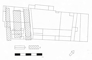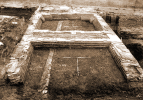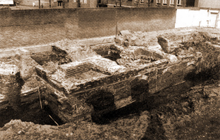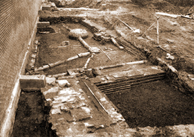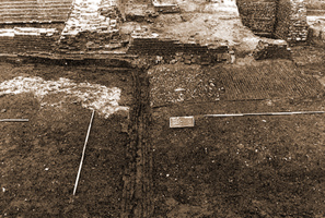 ![]() Bovenop deze kloostermuur liggen nog enkele fragmenten van de kazerne. Links op de foto de verder vrijgelegde waterput van afbeelding 2. | 63 |