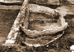 Afb. 1. De gemetselde kuip met onbekende functie. Op de voorgrond is te zien dat hij aanvankelijk groter is geweest. Vermoedelijk beschadigd door vorstwerking is er een nieuwe muur ingezet, waarbij hij iets kleiner werd. Links van de rechte muur is de zuidelijke kloostervleugel, rechts daarvan de binnenplaats van het klooster.