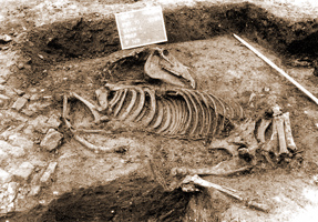 Eén van de begraven paarden, uit de tweede helft van de vijftiende eeuw. Het betreft hier een hengst van een jaar of 15 die met een schofthoogte van ongeveer 1.60m voor die tijd vrij groot was (mededeling van Theo de Jong). We troffen zelfs een kuil aan met drie honden. Uit het feit dat de dieren met een volledig skelet werden | 93 |
