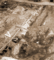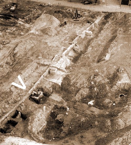 Gezicht op het opgravingsterrein met de lange noord-zuid lopende Diezemuur. Rechts ervan lagen pottenbakkerij, klooster en kazerne. Links stroomde het water van de Dieze en lag 'Den Beemdt vande Geertruyen: zoals dit grasland op de kaart van Bleau uit 1649 wordt genoemd. De pijl wijst op de trap van afbeelding 2. Foto: BAD