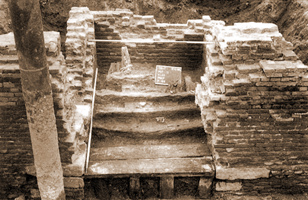 De trap naar de vijftiendeeeuwse Dieze. De hoeken zijn afgewerkt met grote natuurstenen blokken. Op de voorgrond liggen planken op houten palen. Deze horen niet bij de trap, maar vormen de fundering van de gemetselde dichtzetting uit de zeventiende eeuw. Foto: BAD