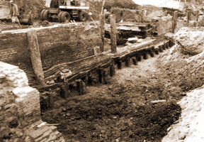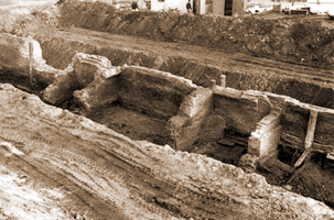 Van links naar rechts de lange Diezemuur met haaks daarop de wanden van de grote kazerne-beerput (de buitenste van de vier). De binnenste twee muren zijn van een kleinere beerput die in de negentiende eeuw midden in de grote put werd gezet. De beerputten zijn bij de sloop in de jaren '50 voor de helft verdwenen. Foto: BAD
