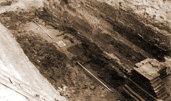 Afb. 1. Rechtsonder op de foto de zware hoekfundering van het 14de-eeuwse huis. De onderste stenen zijn duidelijk groter. Deze zijn afkomstig van de oudste stadsmuur. In het lagere niveau is de houten beschoeiing van gevlochten takken te zien uit de tweede helft van de 13de eeuw. De waterloop lag hier rechts van.