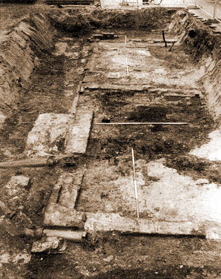 Afb. 2. Het eerste vlak in de tweede opgravingsput. Hier bleek aanmerkelijk minder diep gesloopt. Er waren opvallend veel muren en vloeren van de 15de-eeuwse huizen met latere verbouwingen bewaard. Links van de muren heeft tot in de jaren 30 van deze eeuw de oude Tolbrugstraat gelopen.