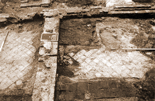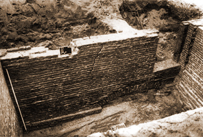 Afb. 1. Ter weerszijden van de tussenmuur zijn restanten van de mortellaag bewaard waarin de afdrukken van de plavuisjes goed te zien zijn.