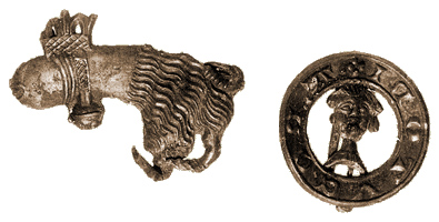 Afb. 4. Twee van de in de rioolsleuf aangetroffen insignes. Een portretkop met er omheen een fantasietekst en een fallus op pootjes met een kroon en een bel. De fallus heeft vermoedelijk ook nog vleugeltjes gehad!
