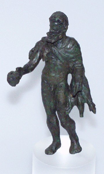 In de jaren 1989-1991 werd in samenwerking met het Instituut voor Pre- en Protohistorie nabij Empel een Romeinse tempel van Bataafse oorsprong opgegraven. Het tempelcomplex bestond uit de eigenlijke tempel gelegen in een ommuurde hof voorzien van een voorhal. Door de vondst van een wijdingsplaatje is vast te stellen dat de tempel gewijd was aan de van oorsprong Bataafse godheid Hercules Magusanus. Het beeldje stelt Hercules bibax, “de drinker”, voor. In zijn rechterhand houdt hij de voor hem kenmerkende drinkbeker vast. Om zijn schouders draagt hij een leeuwenvel. Zijn vaste attribuut, de knots, heeft oorspronkelijk in zijn linkerhand gezeten maar is verdwenen. |