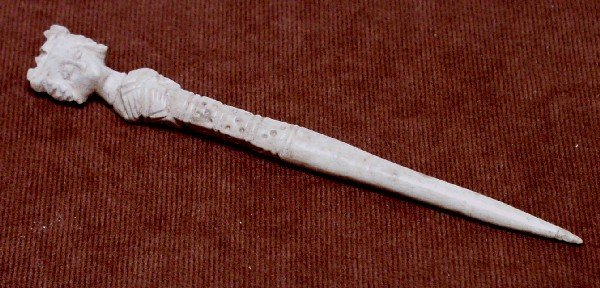 Het bovenste deel van deze fraaie naald, waarschijnlijk vervaardigd van walrusivoor, is voorzien van de beeltenis van een mannen- of vrouwenhoofd. Onder de gekruiste handen zijn de zijden te zien van drie dobbelstenen. Exacte parallellen van dit voorwerp zijn niet bekend. Vaak wordt voor vergelijkbare voorwerpen de volgende suggestie voor de functie gedaan: een schrijfstift, weefinstrument, in de grond te steken speelgoed of een haarnaald. Geen van de genoemde functies lijkt verenigbaar met de Bossche naald, zeker niet met de afgebeelde dobbelstenen. |