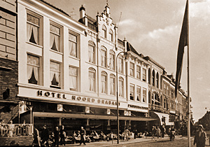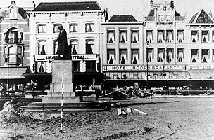 Vandaag: het beroemde hotel Noord-Brabant aan de Markt dat twintig jaar geleden plaatst maakte voor C&A. De Markt is - zo wordt verteld - de huiskamer van Den Bosch. Het biedt een vertrouwde aanblik, maar regelmatig verandert er iets. Twintig jaar geleden maakte een karakteristiek hotel plaats voor een grootwinkelbedrijf, dat nu zelf aan het verbouwen slaat. In 1890 kocht Piet Mulders het Brabants Koffijhuis aan de Bossche Markt. Samen met zijn echtgenote begon hij een hotel in het pand: Hotel Noord-Brabant. Kennelijk was er behoefte aan een dergelijk hotel, want het ging Piet Mulders voor de wind. Hij kocht de panden links en rechts van zijn eerste aankoop aan en breidde zijn hotel sterk uit. Mulders was een van de eersten in Den Bosch die telefoon bezat en onder nummer 171 was hij bereikbaar. Maar ook bij de nieuwe uitbreidingen schuwde hij het moderne comfort niet. Al zijn kamers hadden 75 jaar geleden al warm en koud stromend water, er waren aparte badkamers en de bovenverdiepingen waren met de lift bereikbaar. Al was de auto nog geen gemeengoed geworden: de hotelgasten beschikten kennelijk reeds over een automobiel, want aan de achterzijde bezat Mulders een eigen garage. Niet alleen besteedde hij aandacht aan de hotelgasten, ook Bosschenaren waren hartelijk welkom. Hotel Noord-Brabant bezat een groot restaurant en een forse leestafel. Bovendien bood hij een 'Groot terras met uitzicht op het marktplein' aan zijn bezoekers aan. Tachtig jaar lang bezochten vele Bosschenaren 'Piet Mulder' (de letter 's' werd door hen niet uitgesproken). Vooral de carnavalspartijen waren bekend. In 1969 maakte de familie bekend dat de horecagelegenheid gesloten zou worden. Op dat bericht volgde een bezetting van het terras; niet alleen om het terras zelf te behouden, maar tevens om sloop te voorkomen. Echter zonder succes. Van het eens zo vermaarde 'Piet Mulder' resteert thans nog de gevelsteen (binnen in het moderne pand te zien) en de oude stamtafel (in De Knillispoort). De kledingreus C&A sloopte het leeggekomen hotel. Sloop van het ernaast gelegen neogotische pand kon ook niet voorkomen worden, daar werd slechts het bovenste gedeelte van de voorgevel behouden. De moderne gevel van C&A laat nog wel zien, dat dit deel van het gebouw eens uit drie afzonderlijke panden bestond, maar achter de gevel is het één grote ruimte. De actievoerders uit 1969 die vóór behoud hadden gepleit, voerden bij de officiële opening nog eenmaal actie: zij trokken demonstratief hun broek uit. Twintig jaar bepaalt de huidige voorgevel al mede het gezicht van de Markt. Maar wellicht gaat dat veranderen. Vanaf volgende week is het kledingbedrijf gesloten voor een ingrijpende verbouwing om pas over vier maanden te worden heropend. Misschien dat een hamburgergigant ook onderdak krijgt in dit pand aan de Markt. Dan zal er wellicht naast de letters C en A ook een grote M aan de gevel bevestigd worden. |