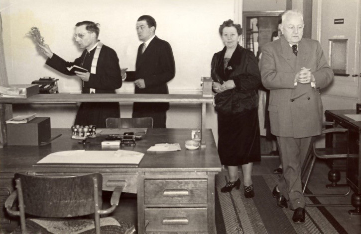 ![body=[]](documenten/textielgroothandel firma gebr. boelens/05.jpg) Zegening kantoor 1e etage: v.l.n.r. plebaan Van Susante, Piet Boelens, Annie en Jo Boelens-Desmense.