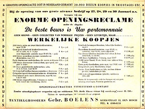 ’s Middags was er een druk bezochte receptie in de enorme woonkamer van Ben en Gien. Er waren obers van Royal die bedienden en gebruik maakten van de woonkeuken. Vanzelfsprekend waren er de textielfabrikanten overal vandaan, maar ook de Bossche middenstand was zeer goed vertegenwoordigd. En natuurlijk de hele familie Boelens. Men had gemeend dat het beter was de burgemeester niet uit te nodigen. “Dan voelt zo’n man zich maar verplicht te komen, die mensen hebben het toch al zo druk”. Tot ieders verrassing verscheen burgemeester Loeff echter onaangekondigd op de receptie om de familie te feliciteren.’s Avonds was er een diner-dansant voor familie en personeel bij ‘Royal’ in de Visstraat. Op de 27e waren de klanten uitgenodigd om de nieuwe magazijnen te komen bekijken. Er waren diverse goedkope stuntaanbiedingen en de kosten van het openbaar vervoer werden vergoed. De openingsaktie met de lage prijzen zou nog de hele week duren. De zaak was iedere dag tot 10 uur ’s avonds geopend. Het assortiment bestond uit het zgn. ‘Twents vak’, dit kan men samenvatten als huishoudtextiel, lakens, slopen, baddoeken, theedoeken e.d. Daarnaast was er de tricotage, ondergoed voor dames en heren, sportbroeken, onderjurken. Op beperkte schaal werden nog stoffen verkocht, maar dit zou niet lang meer duren. Men begon ook al met blouses en pyama’s. Vrijwel alles ging per dozijn. Het was immers een groothandel.