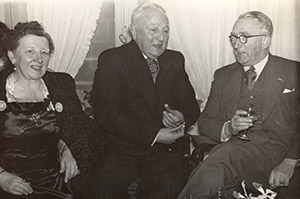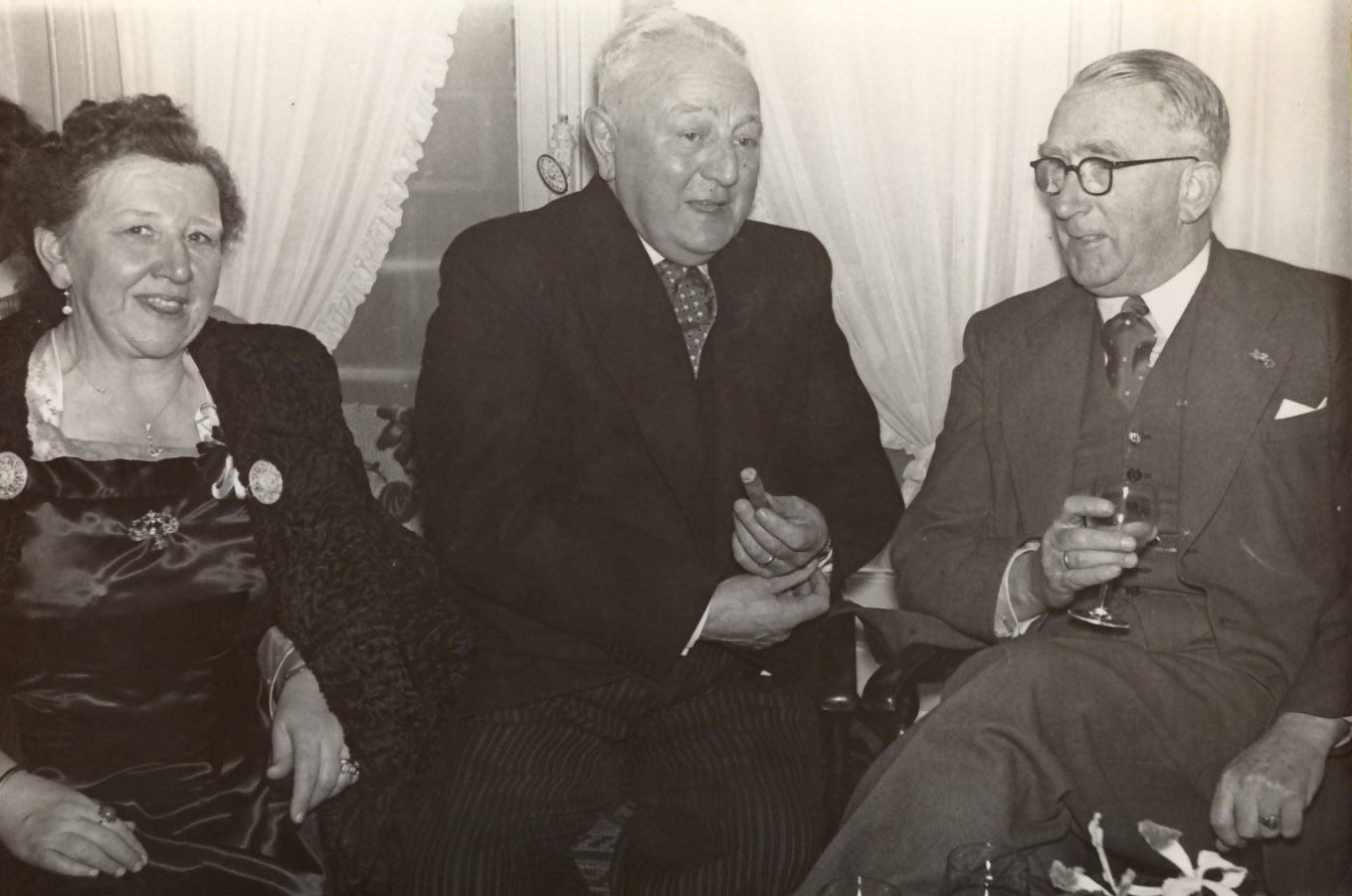 ![body=[]](documenten/textielgroothandel firma gebr. boelens/08.jpg) Annie en Jo Boelens-Desmense met burgemeester Mr Loeff bij de opening van Kerkstraat 32.
