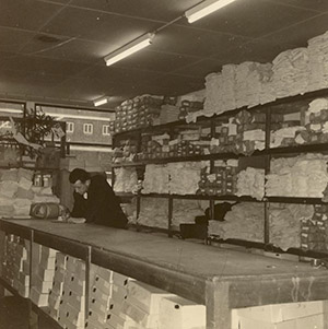 Grootscheepse opening van Kerkstraat 32. De begane grond en de eerste etage waren omgebouwd tot een prachtige zaak. Overal stonden zgn. ‘vakken’ tegen de wanden. Dit waren houten stellages die reikten tot de hoge plafonds met een horizontale vakverdeling van houten planken. Hier en daar stond er een ladder omdat men anders de hooggelegen voorraden niet kon bereiken. Lange tafels/toonbanken waren opgesteld in het midden van de zaak. Er was een goederenweegschaal en een goederenlift. Op de eerste etage, die ook in de tijd van Gebr. Boelens nog altijd ‘de zaal’ genoemd werd, was de inrichting hetzelfde. Met de zaal erbij had men 350 m2 verkoopruimte. De zaak lag propvol met handel, alles keurig opgestapeld, je kon er een lineaal langs leggen. Er lagen planken vloeren in het pand. Aan de achterzijde op de eerste etage was een mooi groot kantoor met de bureaus van Toos en Riet tegenover elkaar met in het midden een opstand. Verder nog een bureau voor de boekhouder. Achter het kantoor lag het privé-kantoor, dat vooral door Ben gebruikt werd. Ook het woonhuis op de tweede etage was helemaal opgeknapt en ingericht. Ben en zijn vrouw Gien Hendriks waren er komen wonen, kort voor de officiële opening, die op 26 januari plaatsvond.