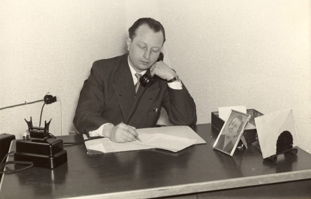 ![body=[]](documenten/textielgroothandel firma gebr. boelens/10.jpg) Ben Boelens op het 'privé-kantoor' 1953.