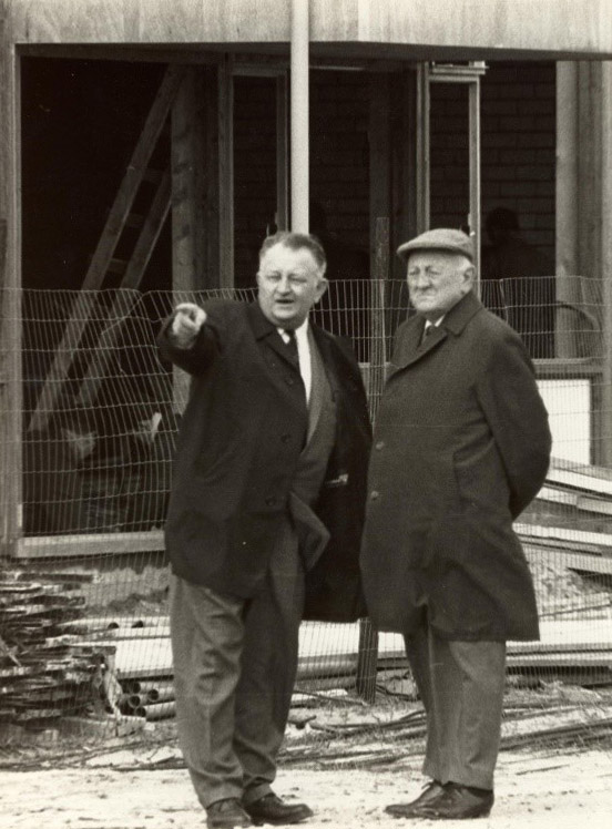 ![body=[]](documenten/textielgroothandel firma gebr. boelens/15.jpg) Ben Boelens leidt zijn vader Jo Boelens rond op het bouwterrein Kasteleinenkampweg 1.