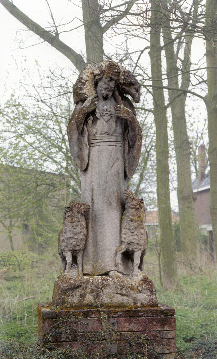 De Ketsheuvel, tegenover huisnummer 14, Orthenafmetingen: 75 x 65 x 185 cm (sokkel 100 x 83 x 90 cm)materiaal: natuursteen op bakstenen sokkel datering: 1944 vervaardigd door: Piet Verdonk74 Het is een traditionele, naturalistische staande Christusfiguur met een schaap over de schouders en twee aan de voeten. Het beeld is na de oorlog aangekocht door de parochie als dank voor de (goede) afloop voor Orthen. Het stond aanvankelijk bij de oude Lambertuskerk. In 1973 is het verplaatst naar de huidige verblijfplaats schuin tegenover het oude kerkhof en achter de Salvatorkerk. | 50 |
