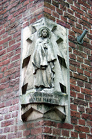 St. Jorisstraat 33, in de voorgevel van het Refugiehuisafmetingen: 95 x 65 cmmateriaal: natuursteen datering: 1947 vervaardigd door: Frans Evers Het beeldje is gehakt in een driehoekig blok natuursteen, dat ingepast is in de hoek van het gebouw. Het is een afbeelding van een staande vrouwelijke figuur in zeer hoog reliëf met scherpe en hoekige vlakken. Eronder staat de tekst: "Herinnering aan Bosch' Marieke". Bosch' Marieke was een volksstuk en tevens een Mariaspel naar een idee van de toenmalige kapelaan van de St. Cathrien. Hij wilde een beter contact bewerkstelligen met en tussen de bewoners van de Oude Hulst, de Weversplaats, De Mortel, de Bandsche Poort en de Berenbijt. In het Spel speelden ongeveer honderd bewoners mee. Het werd voor het eerst opgevoerd in 1947. In totaal werd het in 1947, 1948 en 1949 twintig keer opgevoerd, in 1955 in het kader van de bevrijdingsfeesten en in 1956 voor het laatst. Daarna verdween de oude buurt. De deelnemers aan het spel hadden in 1947 het geld bijeengebracht en het beeldje van Bosch' Marieke laten maken door Frans Evers. De oorspronkelijke plaats was op de hoek Bandsche Poort/Oude Hulst. Toen de huizen werden afgebroken is het beeldje herplaatst. | 52 |