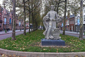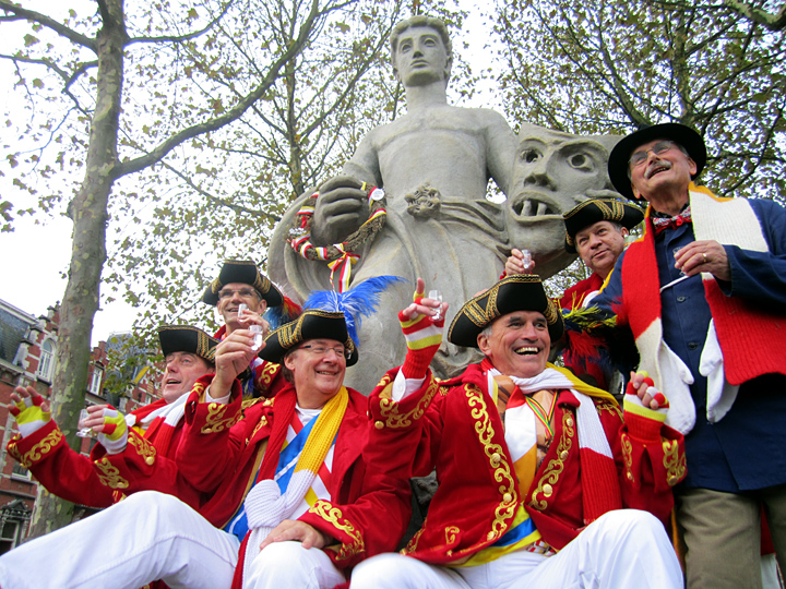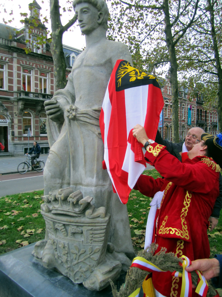Ineens stond het daar, het imposante beeld, op de kop van de Stationsweg, 3 m 20 hoog en 1 m 50 breed, boven op een natuurstenen sokkel. Het is een kunstwerk van de hand van Jo UiIterwaal. Als je vanaf de Wilhelminabrug, richting station gaat, valt je oog er vanzelf op en je vraagt je af wat het beeld voorstelt en waarom het daar is geplaatst. Het beeld draagt de naam “Carnaval”. De werkgroep Het Kleine Monument van de Kring Vrienden van ‘s-Hertogenbosch constateerde in 2012 dat het beeld verdwenen was. Het vormde een paar met een even zo imposant beeld genaamd “Mercurius met Pegasus”. Beide beelden, daterend van 1952, stonden aan de gevel van het vorige Stationsgebouw van van Ravensteijn. Het station werd afgebroken in 1998. Alle kleine monumenten werden geďnventariseerd en op ’n enkel na kregen zij een nieuwe plek bij het huidige station. Het beeld “Mercurius” kreeg een mooie plek op de campus van het Koning Willem I college waar duizenden leerlingen dagelijks langs komen. Het Beeld “Carnaval” kreeg een plek hoog boven op de busremise vóór het station. Daar heeft het vanaf eind jaren negentig gestaan. Enkele jaren geleden werd begonnen met de bouw van kantoren aan het Stationsplein. Een deel van de busremise stond in de weg en werd verwijderd, precies dat deel waar het grote beeld op stond. Na enig zoeken bleek dat het opgeslagen was, maar helaas ernstig beschadigd. De werkgroep heeft vervolgens alles in het werk gesteld om het weer volledig gerestaureerd te krijgen, met duidelijke ondersteuning van de BAM van de gemeente. Wij wilden het terug laten plaatsen vlak bij de originele plek: het station. Daar komt immers de Preins aan op carnavalszondag en wordt hij door duzenden Oeteldonkers uitbundig verwelkomd. Aan de entree van het station bevindt zich ook nog het beeldje van Prins Carnaval. Dat ontvangt ieder jaar een boerenkoolkrans. Wij droomden er van dat het beeld “Carnaval” ook mee zou kunnen doen in de aankomstceremonie en zou worden aangekleed met ’n enorme Oeteldonkse sjaal, zoals bij de Draak gebeurt. In de directe omgeving van het station bleek te weinig ruimte te zijn. Uiteindelijk werd besloten om het beeld “Carnaval” te plaatsen op de huidige plek. We zijn het er over eens: een prominente plek. Het beeld vormt een element in de reeks van carnavalsmonumentjes die de stad rijk is en is dan ook voor Bosschenaren en toeristen van cultureel belang: Couleur locale! De Kring Vrienden heeft een prachtige cultuurhistorische wandeling ontworpen langs deze monumentjes. In de carnavalstijd kun je genieten van deze wandelingen. Ook de VVV heeft een leuke route ontworpen. Het beeld draagt de naam “Carnaval”. Veel Oeteldonkers en bezoekers van de stad zullen zeggen: wat heeft het beeld nou met carnaval te maken. Een Romeins aandoende uitstraling, van een grote kerel met ontbloot bovenlijf! Wanneer je goed kijkt zie je een groot carnavalsmasker in z’n linker hand. Vroeger droegen de carnavalsvierders ’n mombakkes, een masker zeggen wij vandaag de dag. Aan zijn linker voet staat het officiële wapen van ’s-Hertogenbosch. De werkgroep vond dat het beeld een Oeteldonkse ziel moest krijgen om op die manier door de Oeteldonkers omarmd te worden. Het beeld heeft veel weg van een Romeinse consul. Ons oog viel daarom op “Ut ‘Keleezje vaan Konsels vaan Oeteldonk in dun Vrimde”. Op 11-11-2013 was het groot feest: de Kikvorschen, hoogwaardigheidsbekleders van Oeteldonk, HKM en de Consuls onthulden gezamenlijk het beeld. Vanaf dat moment is het ooit verinneweerde beeld een echt Oeteldonks monument en wordt het jaarlijks gekoesterd door het College van Consuls. |