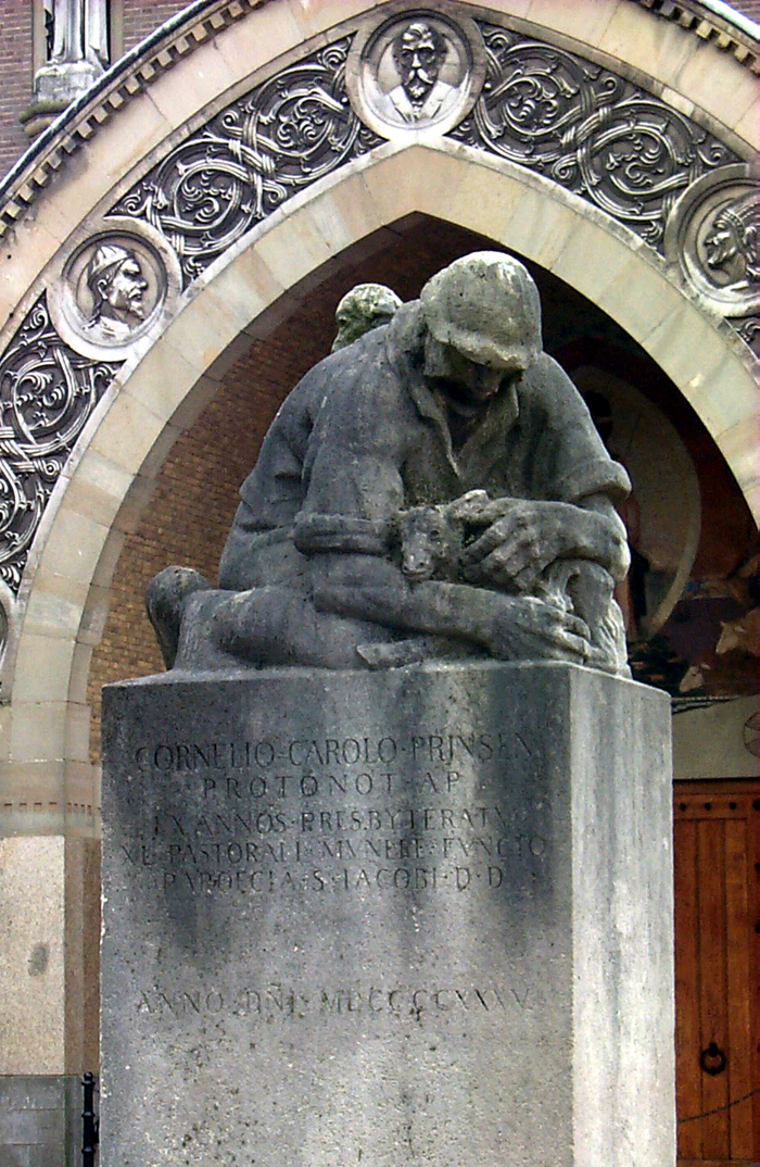 Op het pleintje voor de Sint Jacobskerk, Hinthamerstraat 179afmetingen: 115 x 80 x 150 cm (sokkel in drie delen: hoogte 250 cm)materiaal: Franse kalksteen op sokkel van kalksteen en baksteen datering: 1935 vervaardigd door: Albert Termote (aan de achterzijde gesigneerd: A. Termote) Dit beeld is een -voor die tijd- zeer vrije interpretatie van een Goede Herder, een grove, weinig gedetailleerde, knielende mannelijke (stereotype arbeiders-)figuur met een schaap om de schouders en een in de armen, die nauwelijks los komt uit de blokvorm. Het beeld is in 1935 geplaatst ter ere van mgr. C. Prinsen, toen nog pastoor van de Sint Jacobparochie (1895-1936). Hij was zeer actief geweest voor de arbeidersbeweging en zette zich in tegen het drankmisbruik onder de arbeiders. | 43 |